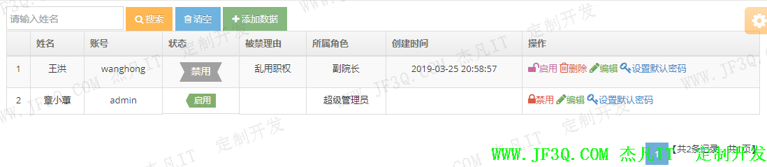 主要是对工作人员的基本信息的录入,包含分配登录密码,账号,禁用(如有违规操作,可对该账号立刻进行永久禁用),启用,添加,编辑,查询,删除,设置默认密码等。部分实现效果图如下: