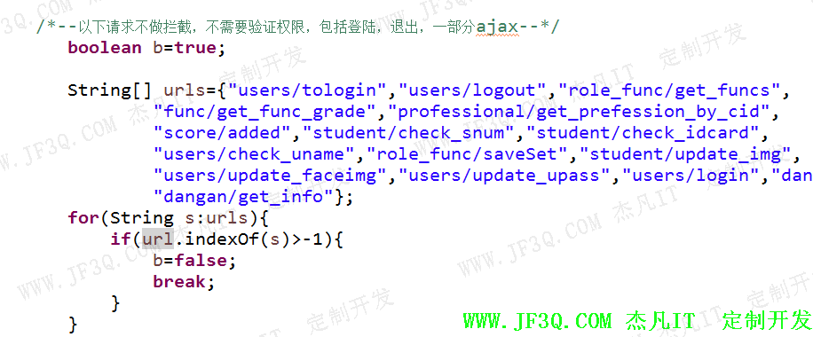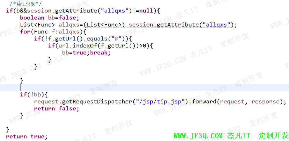 登陆拦截器实现对非登陆用户的拦截和对权限的验证,防止用户通过地址栏输入网址等非正常手段进行越权。在用户登录成功后,将用户登录信息和用户对应的权限信息都存入session,利用拦截将用户每次请求与session里的权限信息经行对比,过滤掉非法操作的请求。实现代码如下: