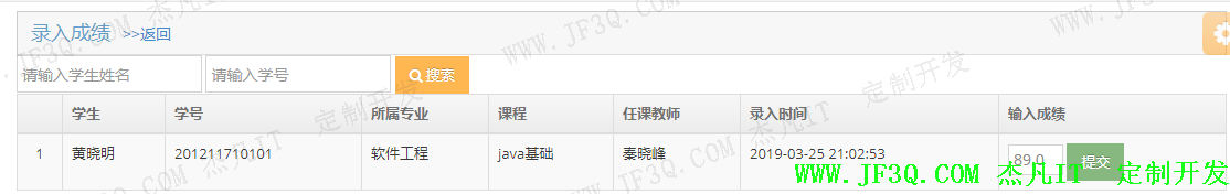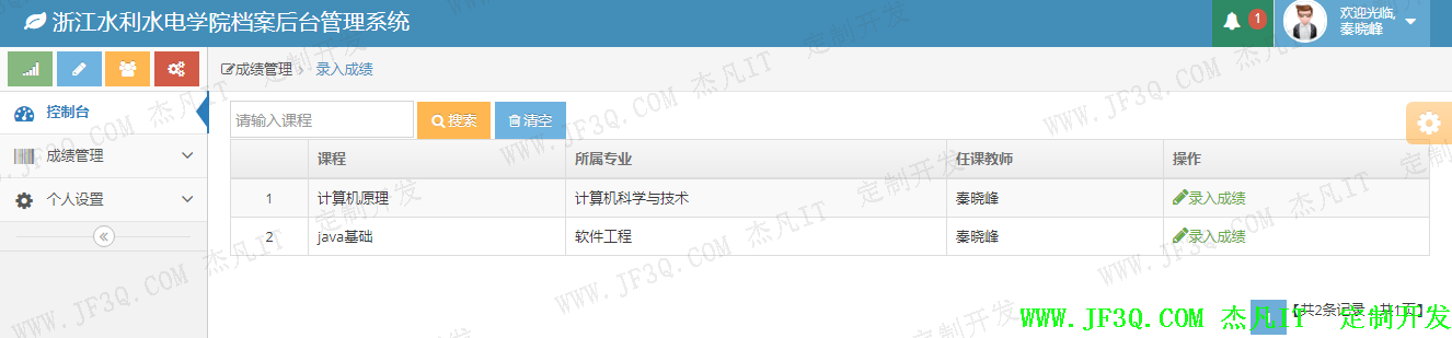 当前登录用户角色为任课教师时。会显示他所带的所有课程,教师可以进行该门课程以下的学生成绩的录入和修改。