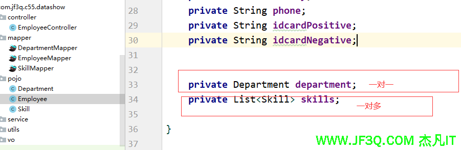 注意:在员工实体类要建两个属性Department和List<Skill>以供写mybatis sql映射文件的时候封装结果集。