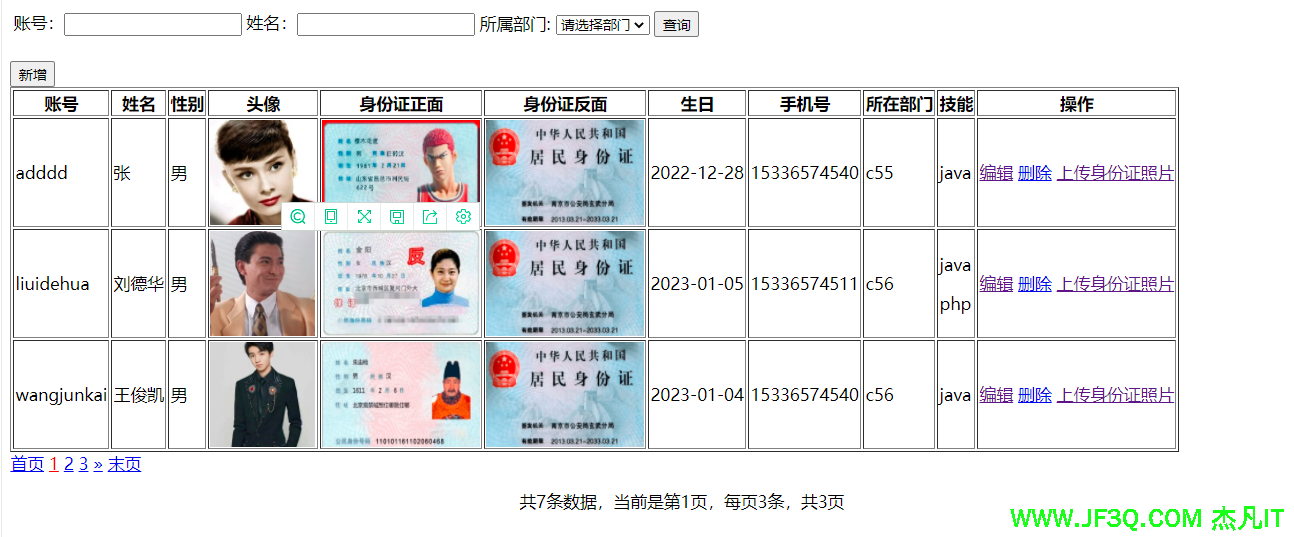 - 当新增用户、编辑用户、删除用户、上传身份证照片的时候不能丢失分页条件,即修改完信息后还在本页。否则用户体验不好。