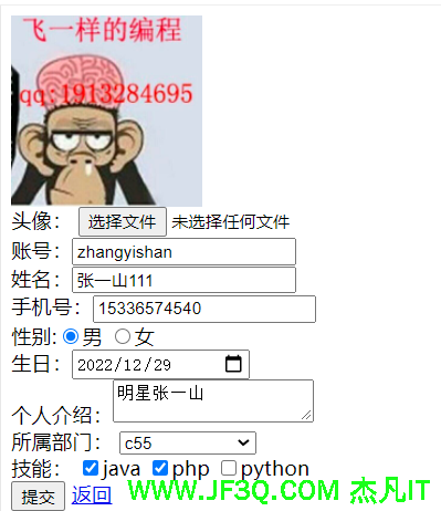 - 头像必选,上传格式要求必须是图片,即png,jpg,jpeg,gif 。并且文件大小不能超过1兆.不符合条件的话不让提交成功。如果是修改头像的话,要把之前的旧头像文件删除。另外就是修改的时候要把头像回显出来。