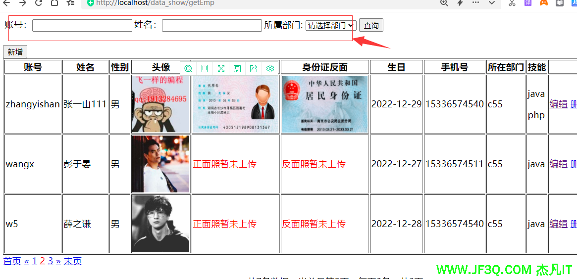 - 三个条件查:账号,姓名,所属部门