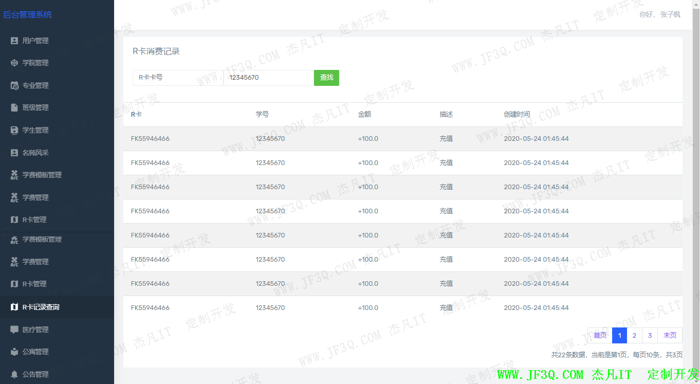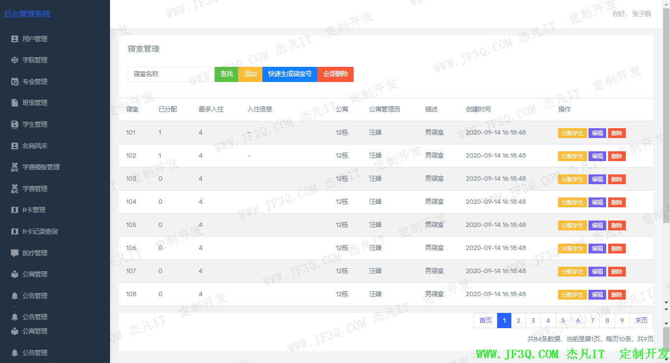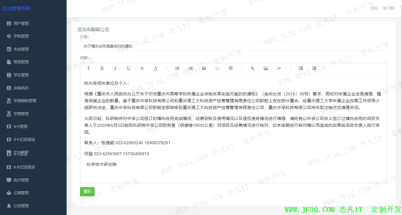 系统根据模块来区分,不同模块的普通管理员具有不同的权限。该系统主要分为:超级管理员、财务处、饭卡管理员、新生接待处、教务处、招生办、学院办等角色。