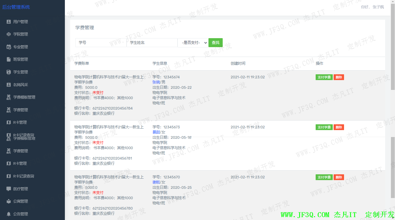 4.学费管理功能的关键代码: