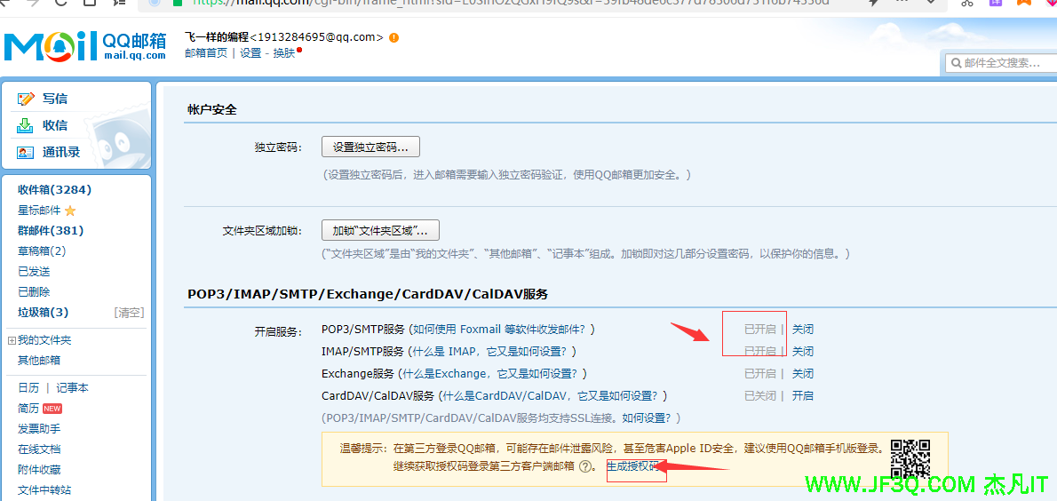 登录你的邮箱,点击设置——账户下操作。最重要的是生成授权码!!!