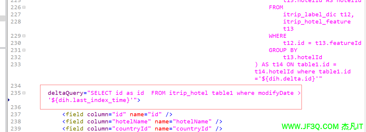 deltaQuery="SELECT id as id FROM itrip_hotel table1 where modifyDate > '${dih.last_index_time}'"> 数据的修改时间大于最新导入数据的时间时就更新下此数据。