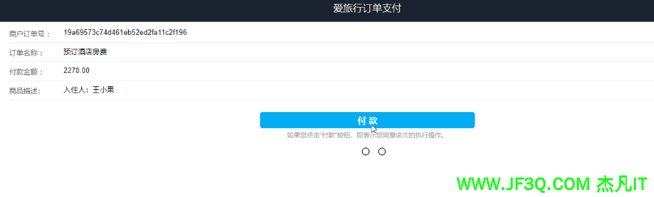 响应 | 注意:订单状态2为支付成功,页面会自动刷新 {"data":{"bookType":0, "bookingDays":1, "checkInDate":1648771200000, "checkOutDate":1648857600000, "count":1,"createdBy":29, "creationDate":1648800212000, "hotelId":25,"hotelName":"比佛利山庄洛杉矶世纪城洲际酒店", "id":169, "invoiceHead":null, "invoiceType":1, "isNeedInvoice":null, "linkUserName":"111", "modifiedBy":null, "modifyDate":null, "noticeEmail":"aa@aa.com", "noticePhone":"13333333333", "orderNo":"D1000001202204011603328f872b", "orderStatus":0, "orderType":1, "payAmount":1928.00, "payType":null, "roomId":106, "specialRequirement":"", "tradeNo":null, "userId":29}, "errorCode":"0", "msg":null, "success":"true"} |