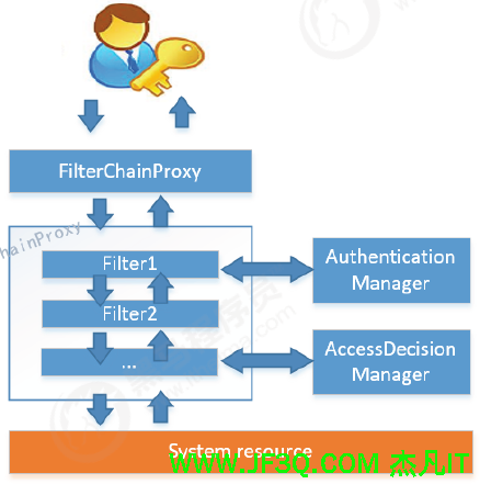 FilterChainProxy是一个代理,真正起作用的是FilterChainProxy中SecurityFilterChain所包含的各个Filter,同时这些Filter作为Bean被Spring管理,它们是Spring Security核心,各有各的职责,但他们并不直接处理用户的认证,也不直接处理用户的授权,而是把它们交给了认证管理器(AuthenticationManager)和决策管理器