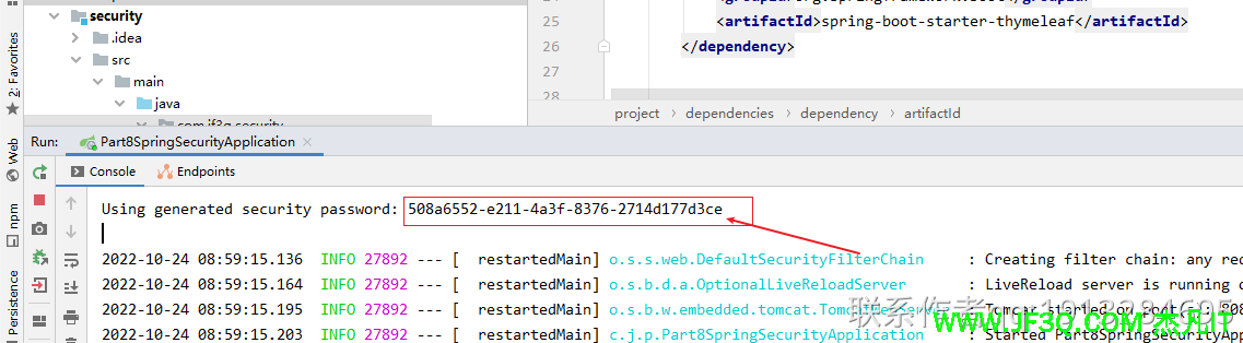 只要引入了security的依赖,默认所有的页面都被拦截到他的登录页面(访问路径是/login,退出登录是/logout)。默认账号是user,密码是启动的时候下图打印的。